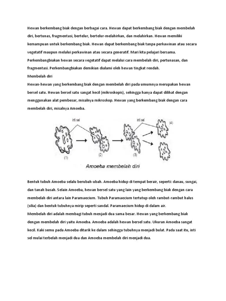 Mereka tidak membutuhkan materi genetik individu lain untuk bereproduksi. Pembelahan dimulai dari membelahnya inti sel menjadi . Amoeba berkembang biak dengan cara. Membelah diri menjadi ciri khas dari perkembangbiakan vegetatif amoeba. Amoeba ini ternyata termasuk ke dalam jenis hewan mikro yang dapat berkembangbiak secara vegetatif atau tanpa melalui proses perkawinan .